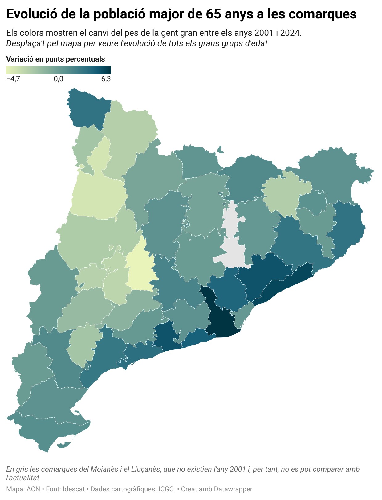 Per comarques, l’envelliment progressiu també és una realitat, ja que fa un quart de segle eren cinc les comarques que tenien més d’una quarta part de la població de 65 anys o més i ara ja són vuit: la Terra Alta, el Priorat, el Ripollès, la Ribera d’Ebre, les Garrigues, el Pallars Jussà, el Berguedà i el Lluçanès.