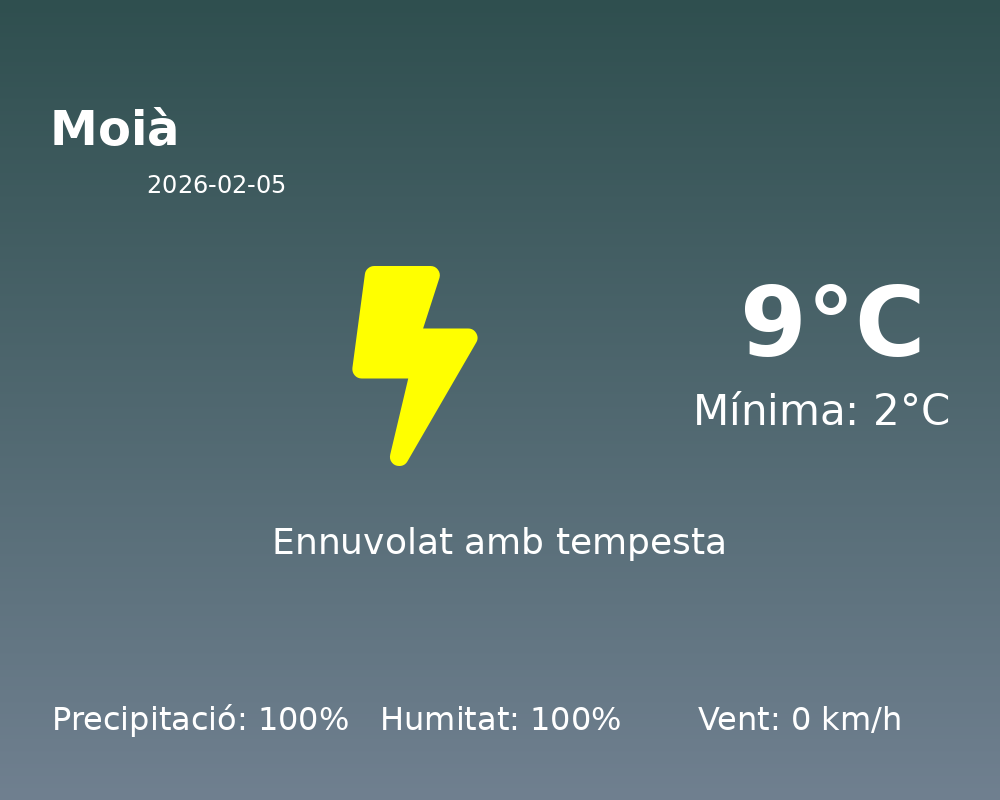 Avui, Moià afronta un dia marcat per les condicions meteorològiques adverses. Les temperatures oscil·laran entre una màxima de 9 °C i una mínima de 2 °C, mantenint un ambient fred durant tota la jornada.