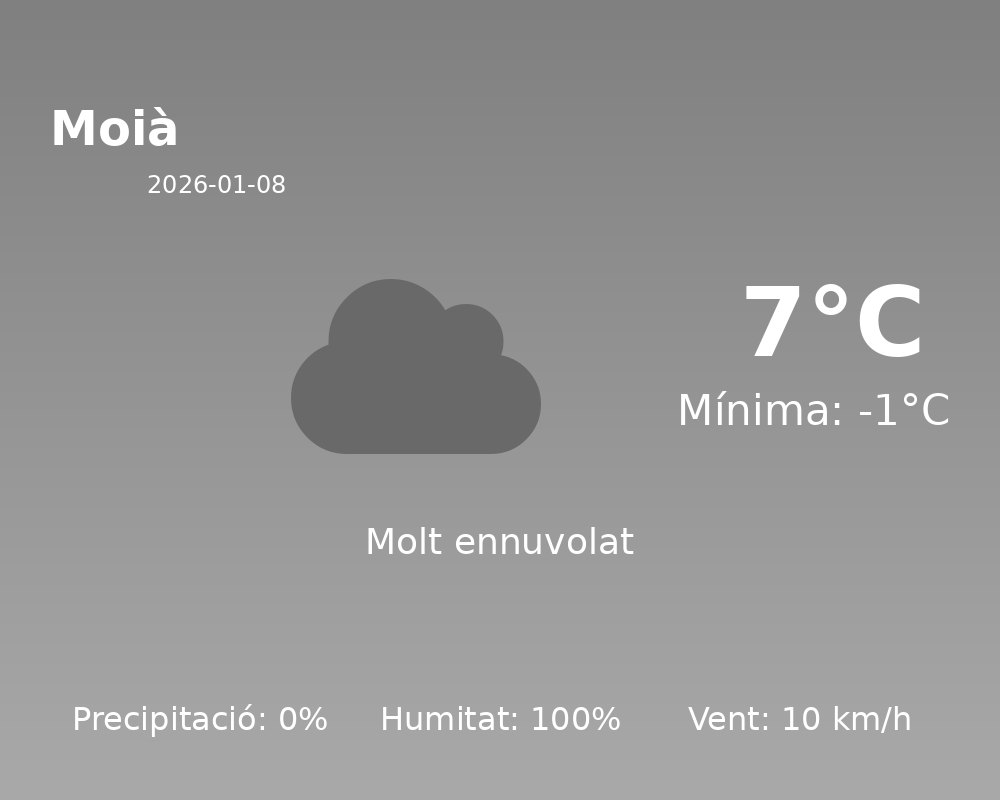 Bon dia, Moià! Avui us portem la predicció meteorològica detallada per a la vostra ciutat. Aquest 8 de gener, esperem un clima hivernal típic de la comarca, amb temperatures fredes i humitat elevada.