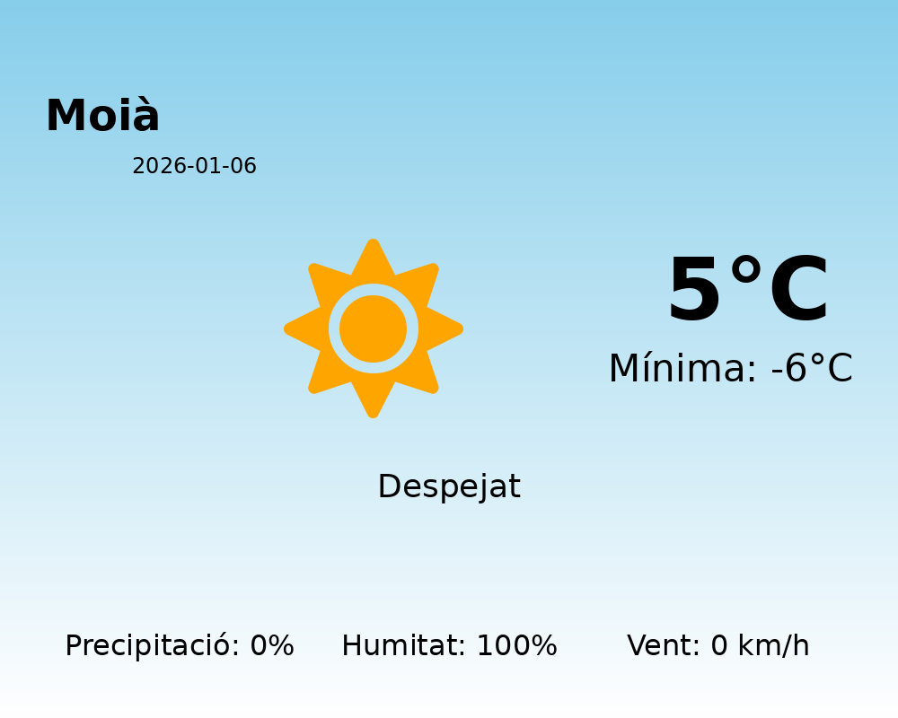 Avui, a la tranquil·la localitat de Moià, esperem un dia marcat per condicions hivernals destacades. La temperatura màxima serà de només 5 graus Celsius, mentre que la mínima s’abaixarà fins als -6 graus Celsius.