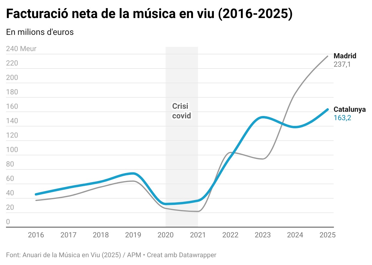 La facturació de la música en viu a Catalunya remunta fins als 163,2 milions d’euros però es manté per darrere de Madrid