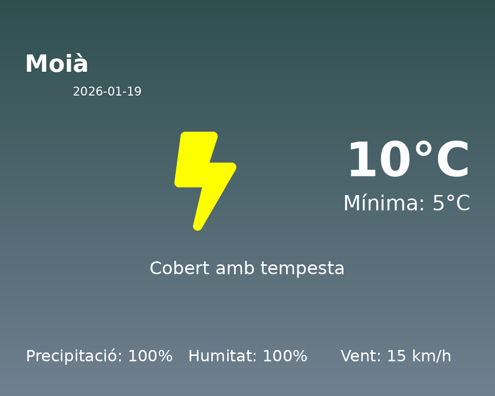 En la jornada d’avui a Moià, ens trobem davant unes condicions meteorològiques que seran molt humides i inestables. La temperatura màxima prevista és de 10°C, mentre que la mínima no s’espera que baixi dels 5°C.