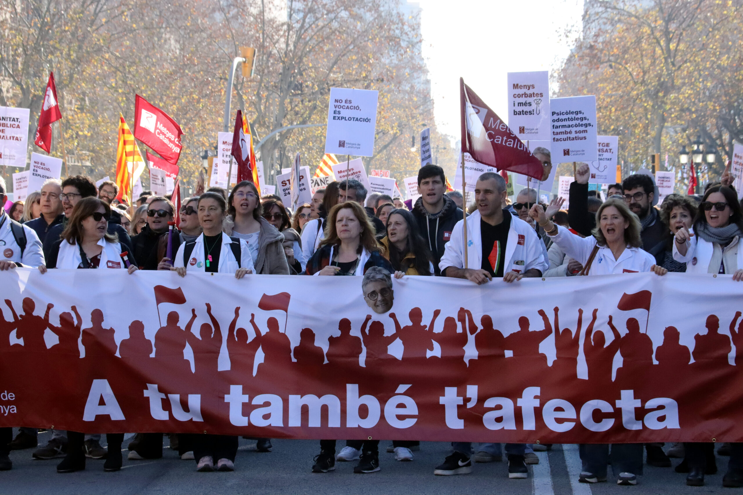 Durant la marxa, s’han sentit consignes com ‘no és vocació, és explotació’, ‘conveni propi ja’, ‘metge cansat, pacient maltractat’ i ‘menys corbates i menys bates’. Els metges també han demanat la dimissió de la consellera de Salut.
